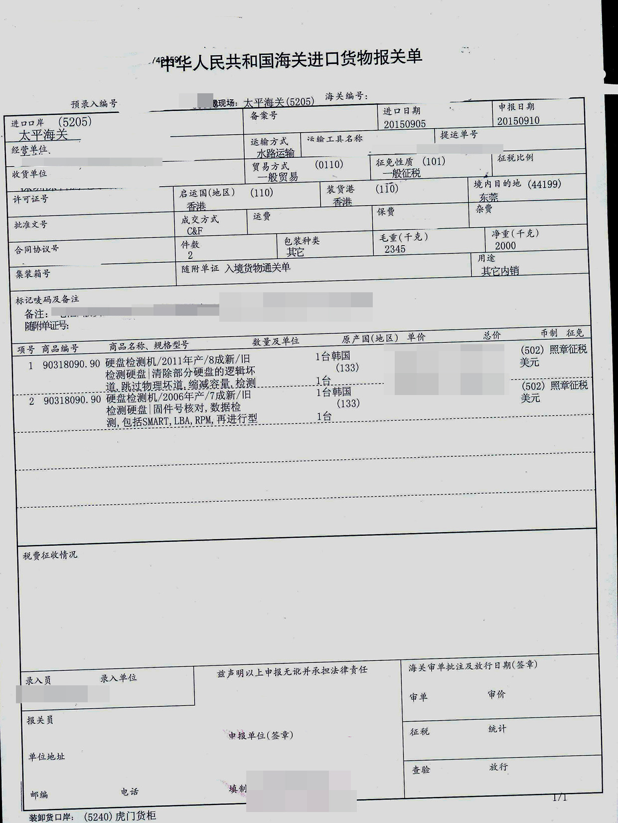 四、舊硬盤(pán)檢測(cè)機(jī)進(jìn)口報(bào)關(guān)案例展示