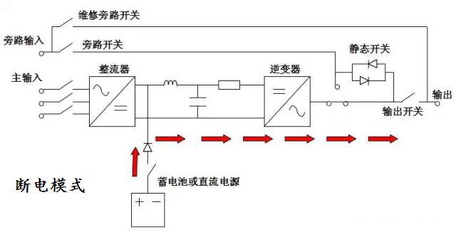 當(dāng)市電輸入正常時(shí),UPS 將市電穩(wěn)壓后供應(yīng)給負(fù)載使用,此時(shí)的UPS就是一臺(tái)交流式電穩(wěn)壓器,同時(shí)它還向機(jī)內(nèi)電池充電;當(dāng)市電中斷(事故停電)時(shí), UPS 立即將電池的直流電能,通過(guò)逆變器切換轉(zhuǎn)換的方法向負(fù)載繼續(xù)供應(yīng)220V交流電,使負(fù)載維持正常工作并保護(hù)負(fù)載軟、硬件不受損壞。從而達(dá)到不間斷供電的目的。