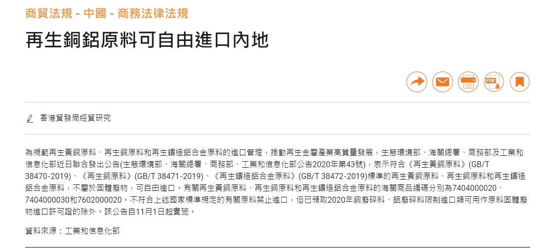 為規(guī)范再生黃銅原料、再生銅原料和再生鑄造鋁合金原料的進口管理,推動再生金屬產(chǎn)業(yè)高質量發(fā)展,生態(tài)環(huán)境部、海關總署、商務部及工業(yè)和信息化部近日聯(lián)合發(fā)出公告(生態(tài)環(huán)境部、海關總署、商務部、工業(yè)和信息化部公告2020年第43號),表示符合《再生黃銅原料》(GB/T 38470?2019)、《再生銅原料》(GB/T 38471?2019)、《再生鑄造鋁合金原料》(GB/T 38472?2019)標準的再生黃銅原料、再生銅原料和再生鑄造鋁合金原料,不屬于固體廢物,可自由進口。有關再生黃銅原料、再生銅原料和再生鑄造鋁合金原料的海關商品編碼分別為7404000020、7404000030和7602000020。不符合上述國家標準規(guī)定的有關原料禁止進口,但已領取2020年銅廢碎料、鋁廢碎料限制進口類可用作原料固體廢物進口許可證的除外。該公告自11月1日起實施。